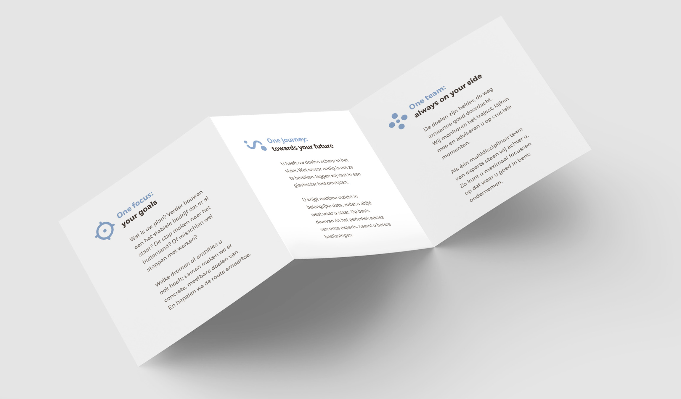 Coming up with a new name starts with the identity of the organization. What are the objectives, who and what do you want to achieve with it. This naming process had to complement the corporate 'WVDB' but still generate a certain individuality. We did this in style (visual) but also by supplementing the whole with part storytelling, translated into the three icons; One Focus, One Journey, One Team. A catchy slogan; Together as One. And a strong promise: Together we make entrepreneurship great.