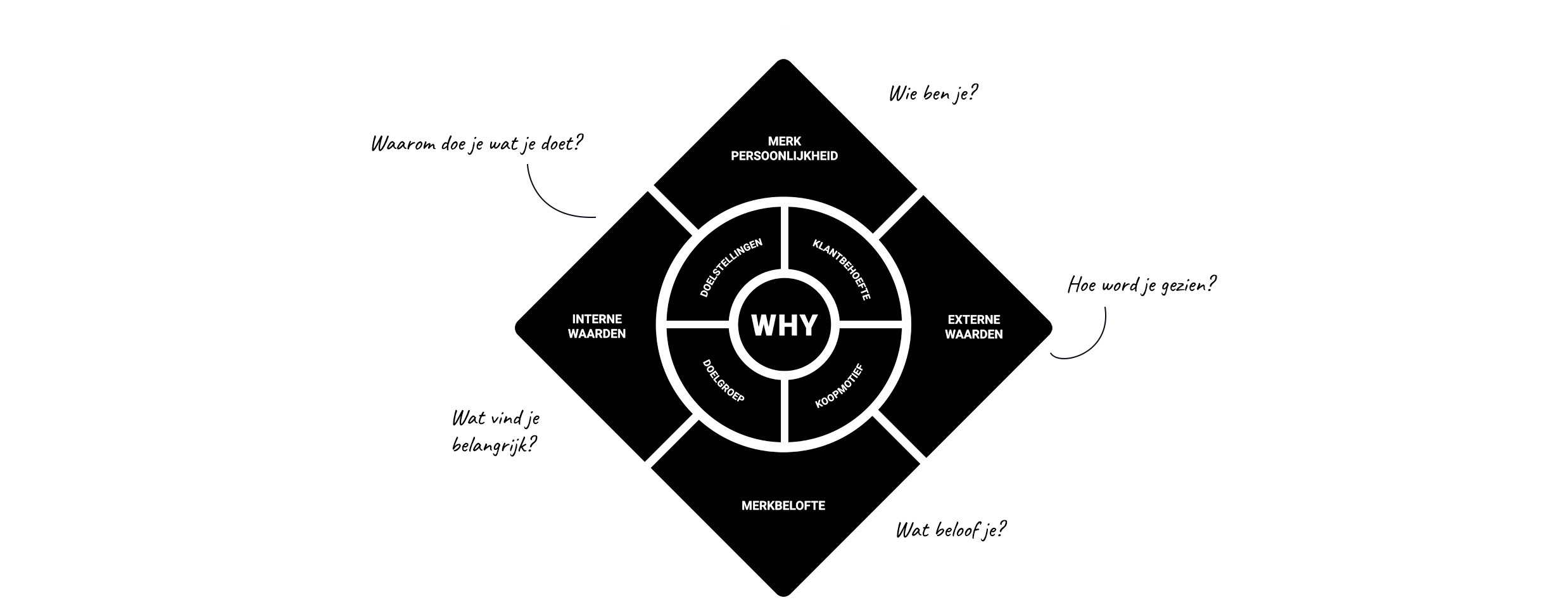 De Why How What, ook wel de Golden Circle genoemd, is een denkmodel ontwikkeld door Simon Sinek en vormt de ziel van je organisatie. Als je deze helder hebt, creëer je een solide fundament voor je merk. In enkele sessies gaan we samen met het coreteam op zoek naar antwoorden en eenmaal gevonden, zorgen we ervoor dat deze scherp geformuleerd en vastgelegd worden.