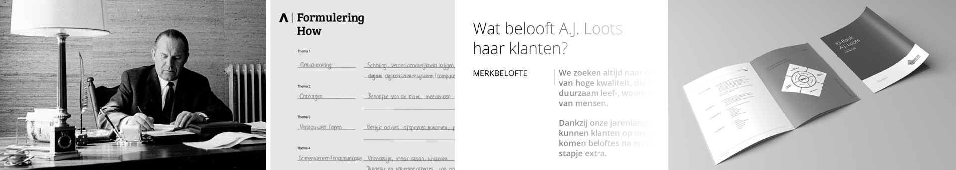 Het logo is één van de belangrijkste visuele uitingen van een merk en het is daarom van belang dat het laat zien waar je merk voor staat. Het oude logo van AJ. Loots was opgebouwd uit verschillende elementen die weinig samenhang hadden en bovendien niet consistent toegepast werden. Uitgegaan van de werkelijke identiteit van de organisatie hebben we een grondige rebranding gedaan waarbij het karakter en haar doelstellingen voelbaar is. Mét respect voor de historie van het merk. Kleurgevoel en vormtaal zijn meegenomen in het nieuwe ontwerp. Het beeldmerk, gevormd uit de bekende ruit staat als kroontje op het werk van AJ. Loots. Een koninklijke verwijzing naar de kwaliteit die zij al zo lang leveren.