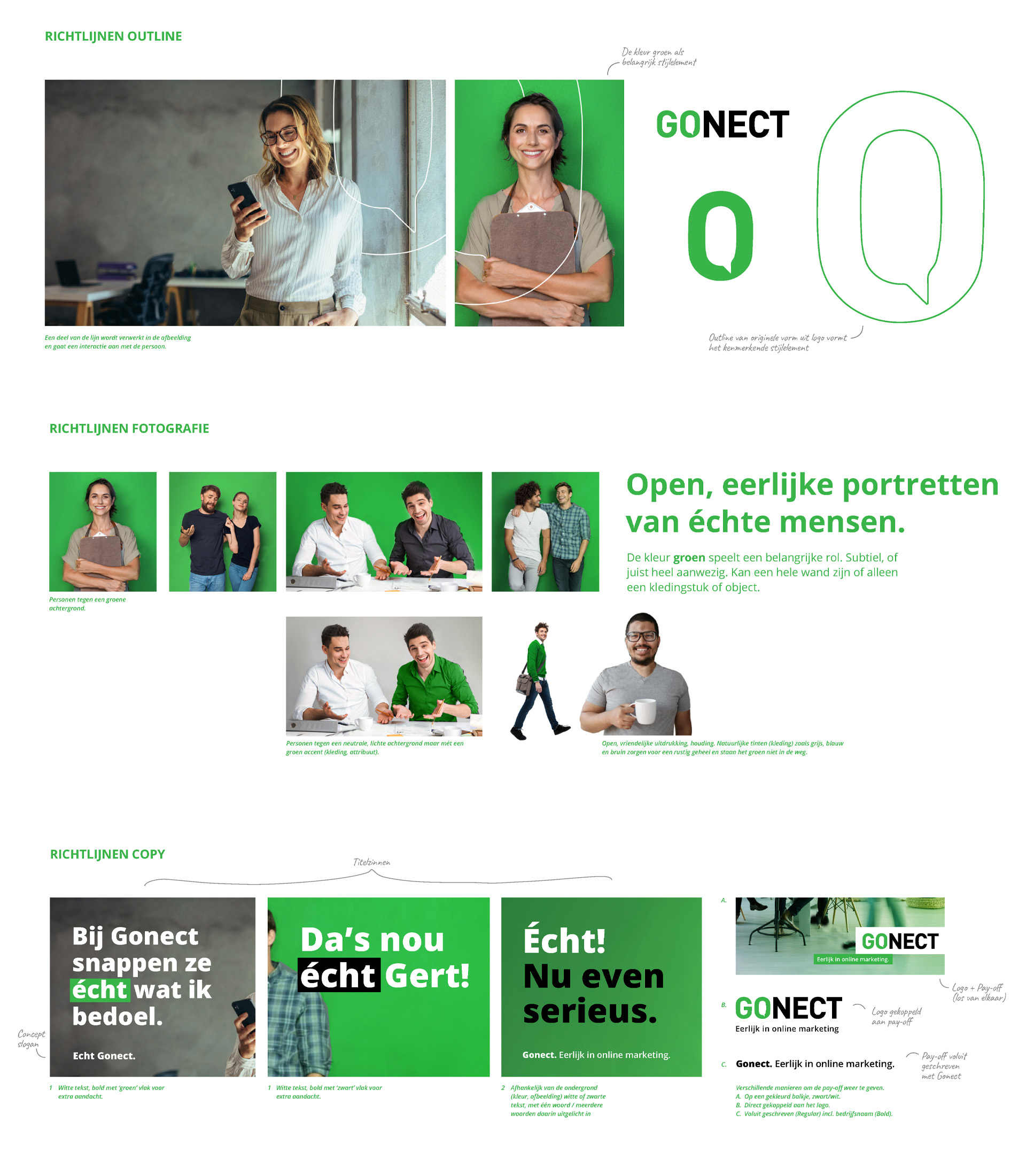 Gonect heeft aangegeven hier zelf mee aan de slag te willen gaan. En wanneer deze elementen consistent doorgevoerd worden, zorgt het niet alleen voor een heldere eenduidige uitstraling, maar maakt ook voelbaar én zichtbaar dat er een kwalitatieve vernieuwing gaande is. Het daarom zorgvuldig vastleggen van de afgesproken stijlregels is aan te raden, zodat iedere externe partij die met het merk gaat werken, eenzelfde identiteit visualiseert.