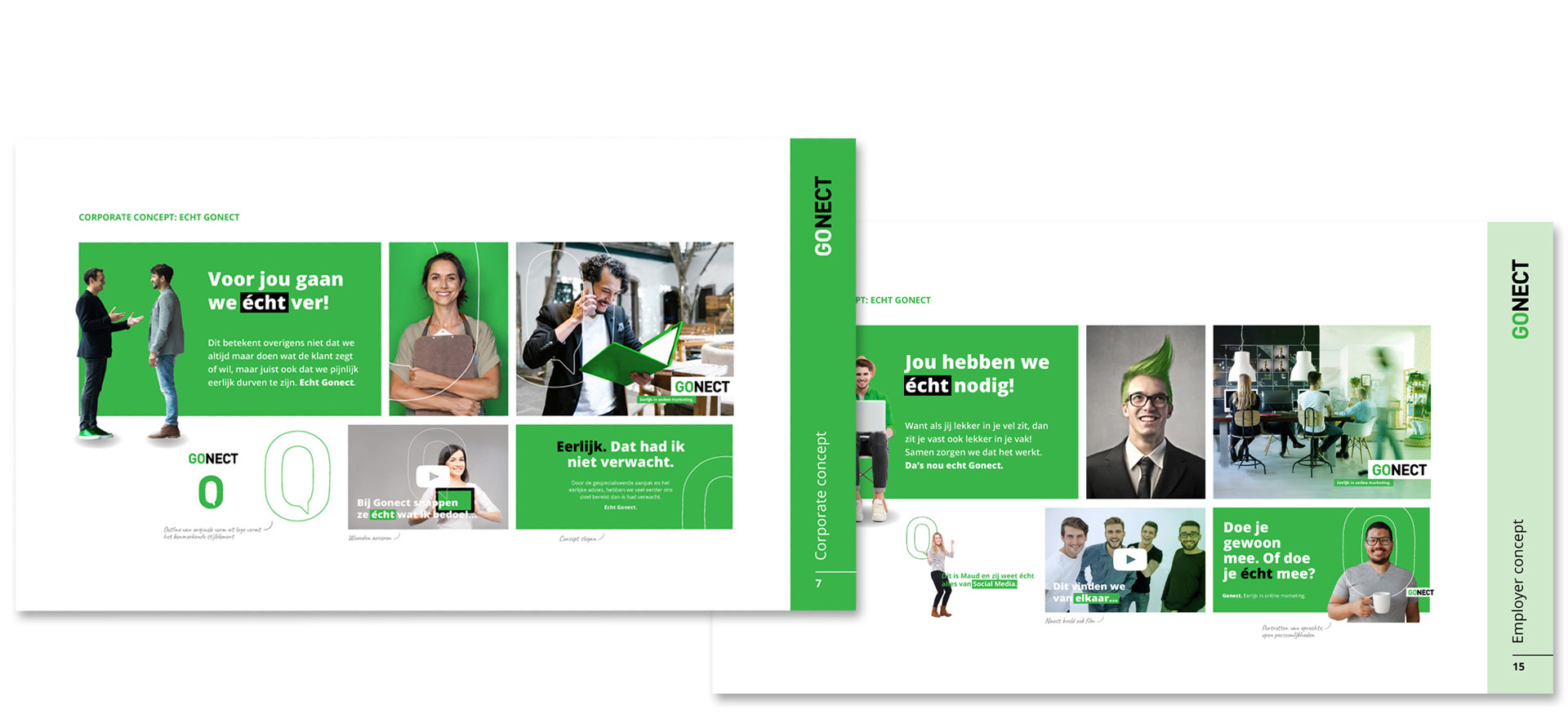 Vanuit de positionering en de identiteit formuleren we de merkbelofte. Een merkbelofte is een korte pitch en vormt de essentie van het merk. Wat kun je bieden, beloven én waarmaken. Het is een belofte die je als organisatie in de praktijk waarmaakt. Iedere dag opnieuw. Belangrijk is dus dat iedereen binnen de organisatie de merkbelofte kent. Om dit te vereenvoudigen vertalen we de merkbelofte naar een pakkende pay-off waaraan iedereen het verhaal en de belofte kan ophangen. Voor Gonect hebben we onderscheid gemaakt tussen corporate en employer branding: