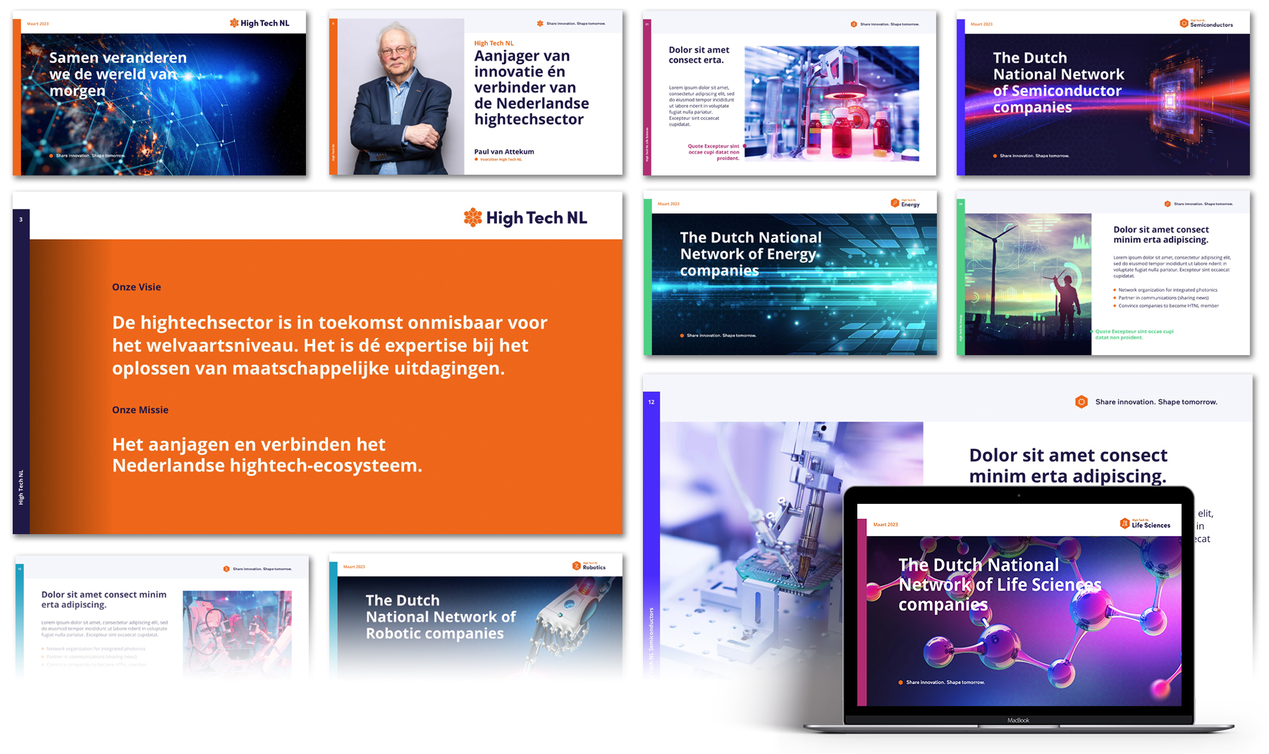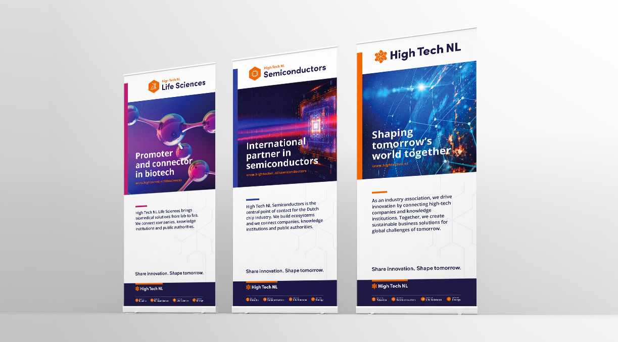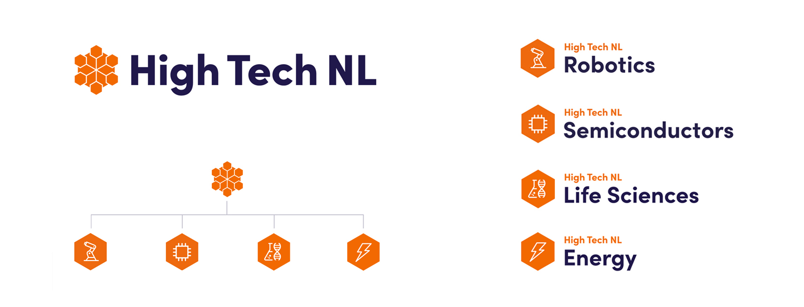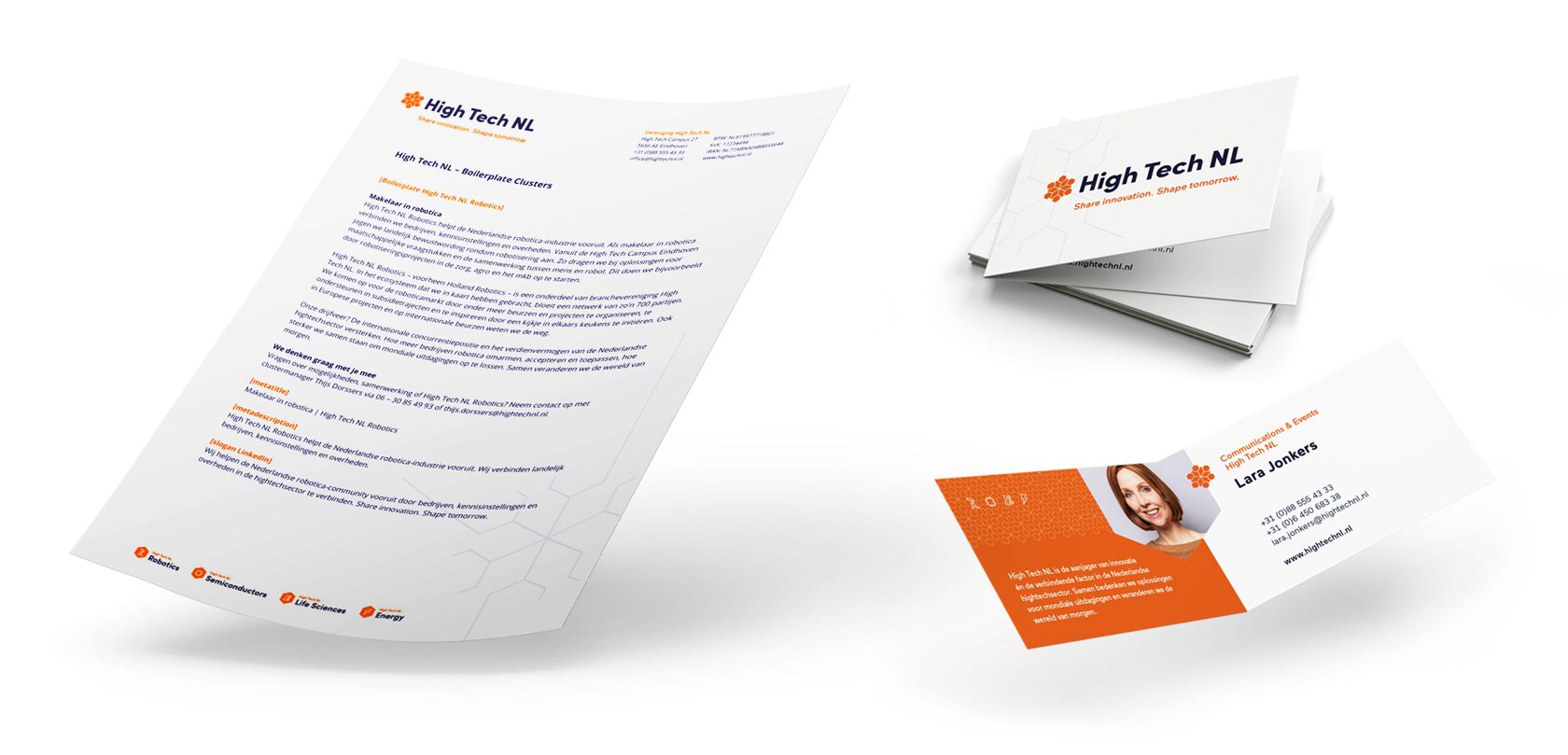 Alle merkbouwstenen hebben we onderhanden genomen, gekneed en gevormd tot een vernieuwde stijl die naadloos aansluit bij de identiteit van High Tech NL. Een sprekende beeldtaal ter ondersteuning van positionering en stijl maakte het geheel compleet. Zo ontstond er ook een nieuwe beeldbank met voor iedere cluster een eigen set aan beelden.